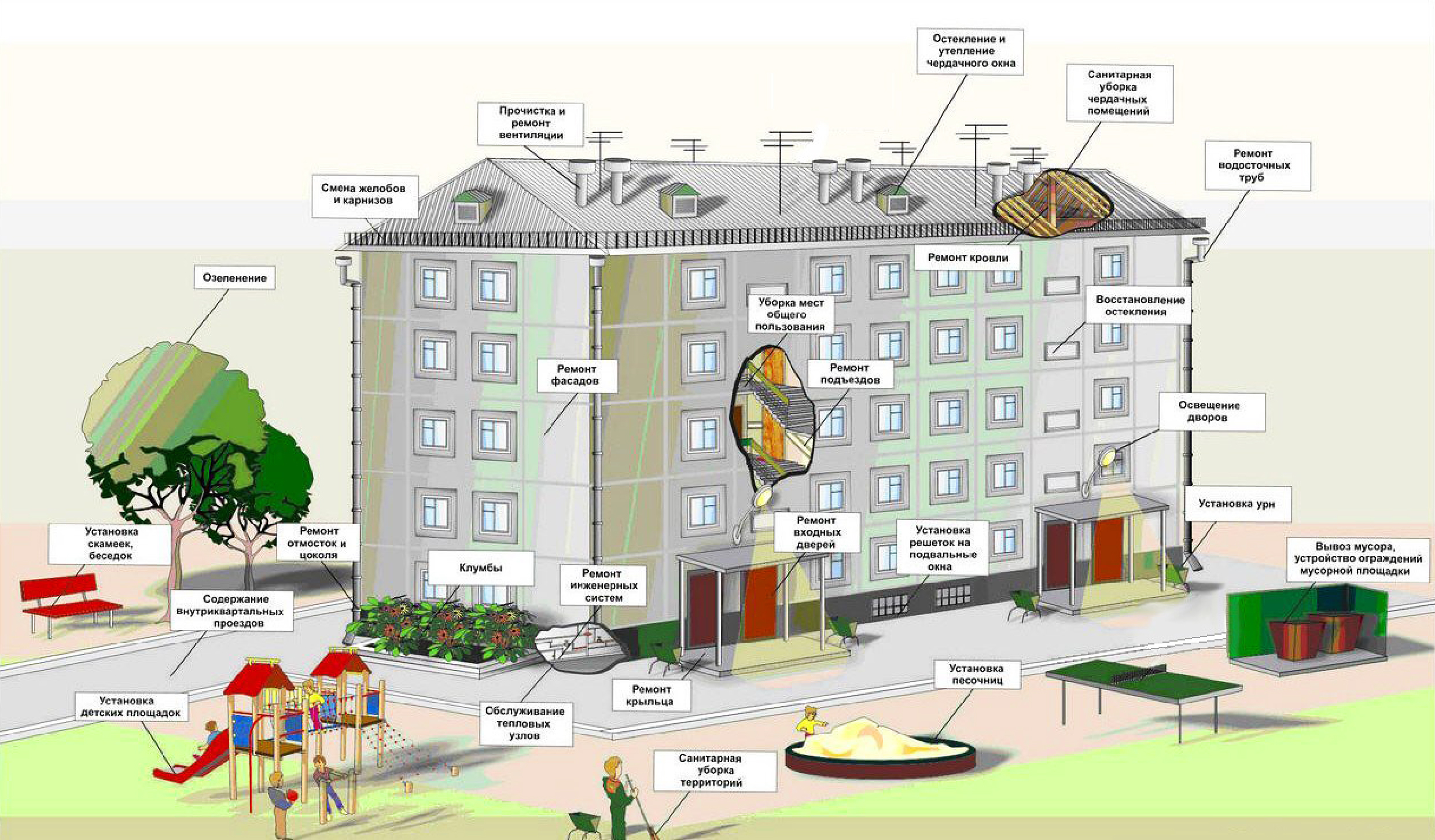 - Техническое обслуживание — комплекс работ по поддержанию исправного состояния элементов и внутридомовых сетей здания