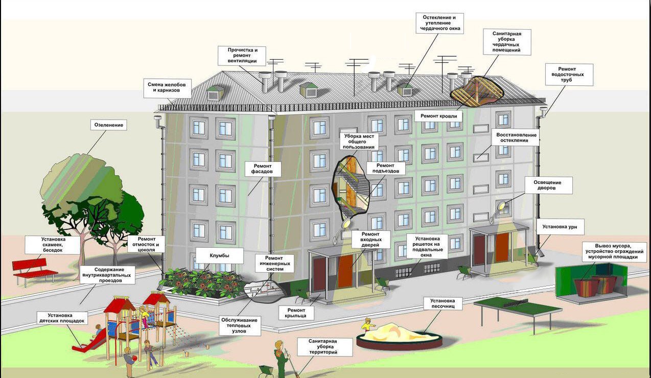 - Техническое обслуживание — комплекс работ по поддержанию исправного состояния элементов и внутридомовых сетей здания