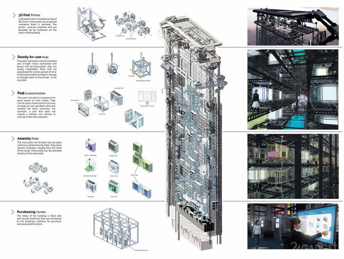 Само здание выполнено в формате каркаса с пустыми ячейками, в дальнейшем в них будут монтироваться «свежепостроенные» жилищные блоки. Специальные строительные 3D-аппараты предлагается установить на крыше небоскреба. Свою работу они начнут выполнять только после того, как покупатель выбрал и утвердил проект квартиры. По окончанию печати блоки с помощью кранов опустят на нужный этаж в пустую ячейку и там закрепят, подключит ко всем необходимым системам.
