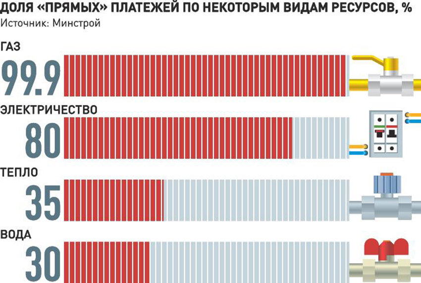 По воде 30 процентов всех лицевых счетов в многоквартирных домах оплачивается напрямую, это примерно 12 миллионов счетов. Лидерами в этой сфере являются такие города, как Благовещенск, Петрозаводск, Березники, где до 90 процентов счетов оплачиваются поставщикам воды, в Омске и Воронеже около 70 процентов, в Самаре - 60 процентов.