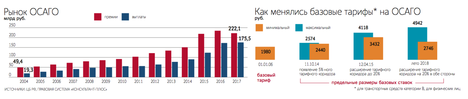 К концу лета 2018 года Банк России одномоментно расширит тарифный коридор базового тарифа по полисам обязательного страхования автогражданской ответственности (ОСАГО) на 20% — как вверх по цене, так и вниз, сообщил 15 мая заместитель председателя ЦБ Владимир Чистюхин. Это произойдет в рамках первого этапа общего комплекса мер, направленных на стабилизацию ситуации на рынке ОСАГО, который уже несколько лет является убыточным. По данным ЦБ, в 2017 году убыток страховщиков от ОСАГО составил 15 млрд руб.