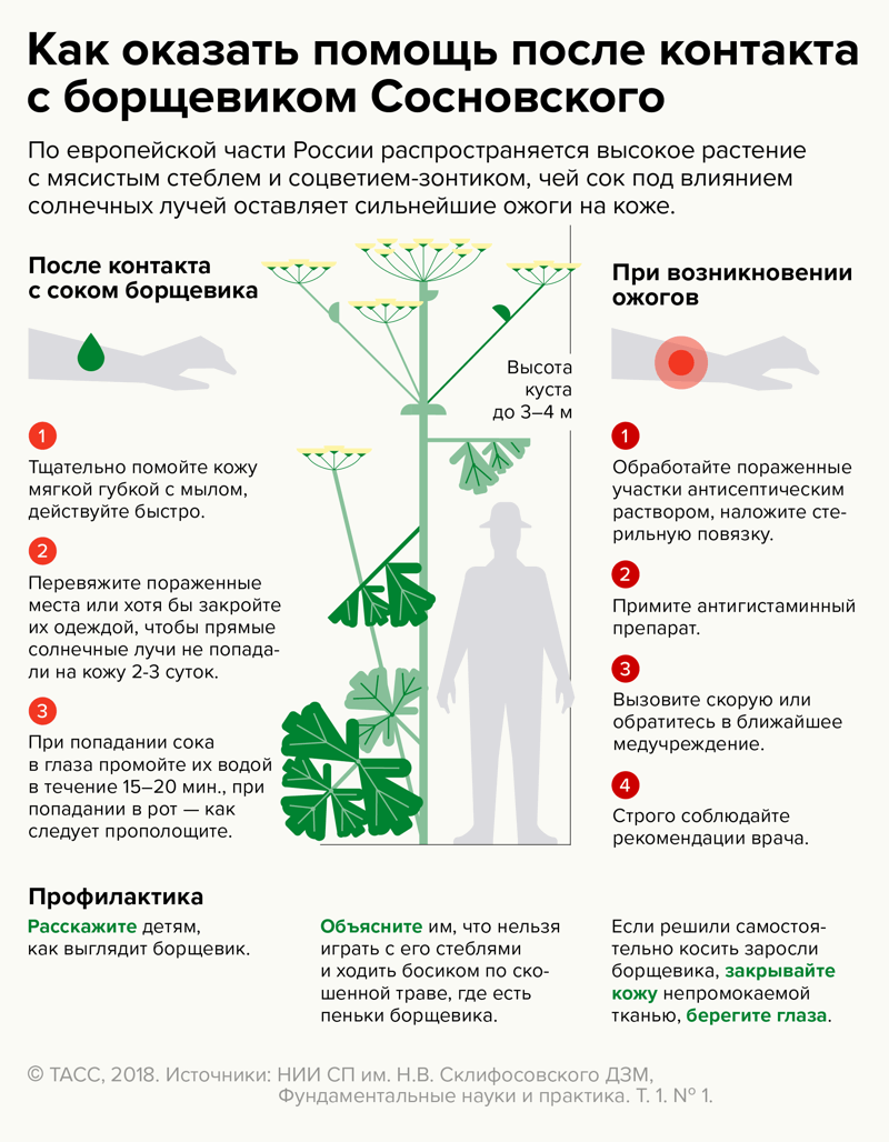 Растение нельзя брать голыми руками и вообще лучше не стоять рядом, особенно в жаркий день (вниманию любителей селфи с красивыми зонтичными растениями). Любые манипуляции с ним нужно проводить исключительно в плотных резиновых перчатках и закрытой одежде. По возможности необходимо те места, где перчатки соприкасаются с манжетами рукавов, обмотать скотчем.
