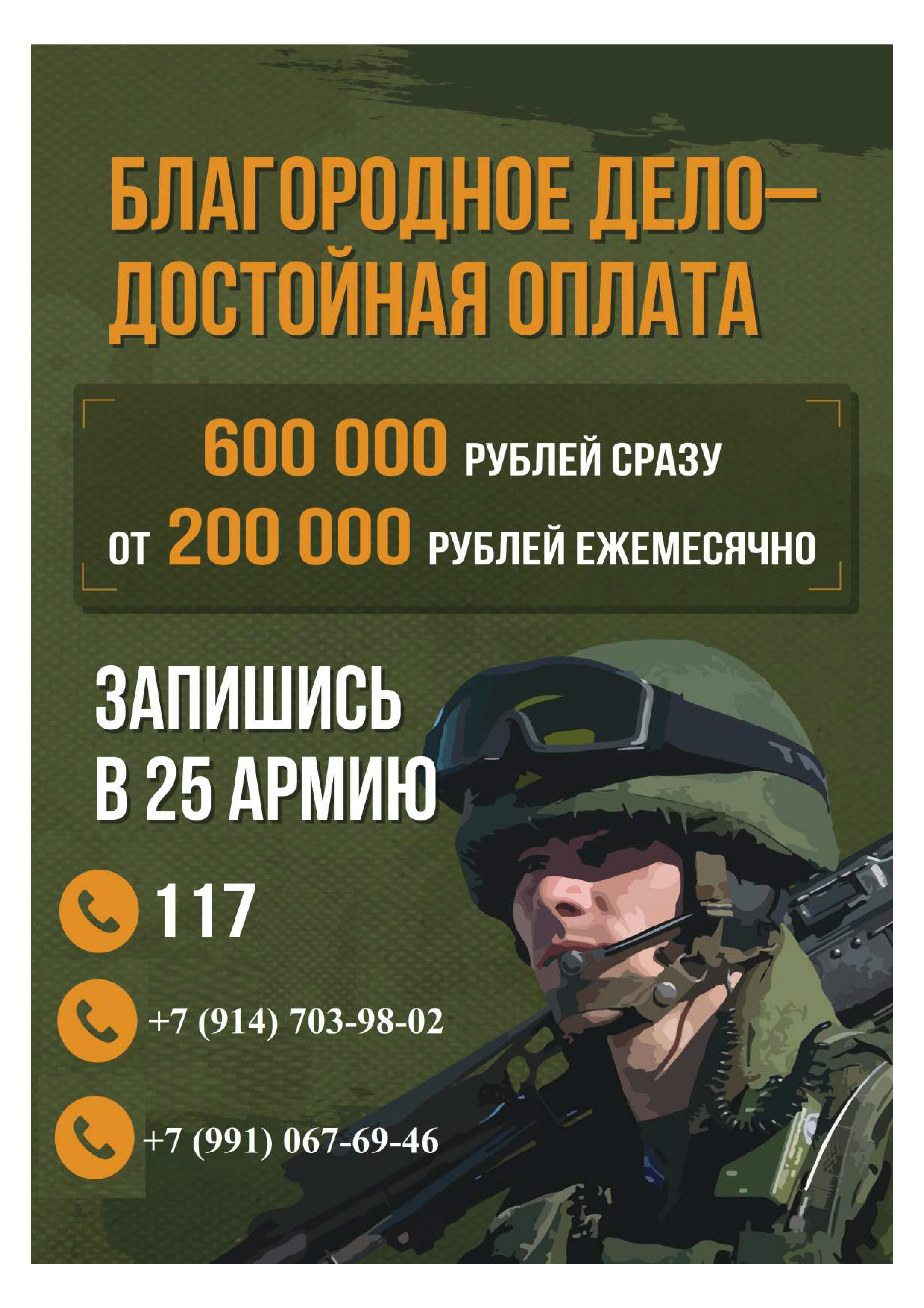 Если вас заинтересовало наше предложение, то за более детальной информацией вы можете обратиться в пункт отбора на военную службу по контракту в Вооруженные силы Российской Федерации по телефонам: 221-64-83, +7 (991) 067-69-46, +7 (914) 703-98-02 или явиться лично по адресу: г. Владивосток, ул. Верхнепортовая, д. 12а (2 этаж).